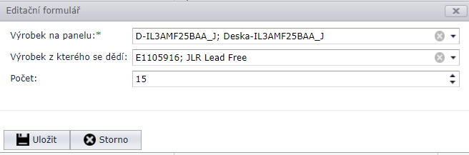 Následně editovat vytvořený záznam a nastavit „Produkt“, ze kterého se dědí. Dále pak v nastavení „Složení panelu“ je potřeba editovat položku na panelu a nastavit, jaký produkt vzniká a z kterého se dědí s počtem kusů.