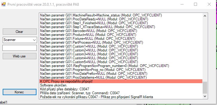 - na screenu je vidět, že pracoviště má komunikovat s OPC, ale nepodařilo se mu připojit, na semboxu je Software ukončen
