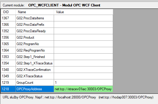 - v core modules, OPC WCF Client modul, hodnota s OID 1218: OPCProxyAdress: net.tcp://xtracev01iac:30003/OPCProxy(musí být nastavena na server na kterém se KepServerV4 nachází, v našem testovacím případě je to xtracev01iac)