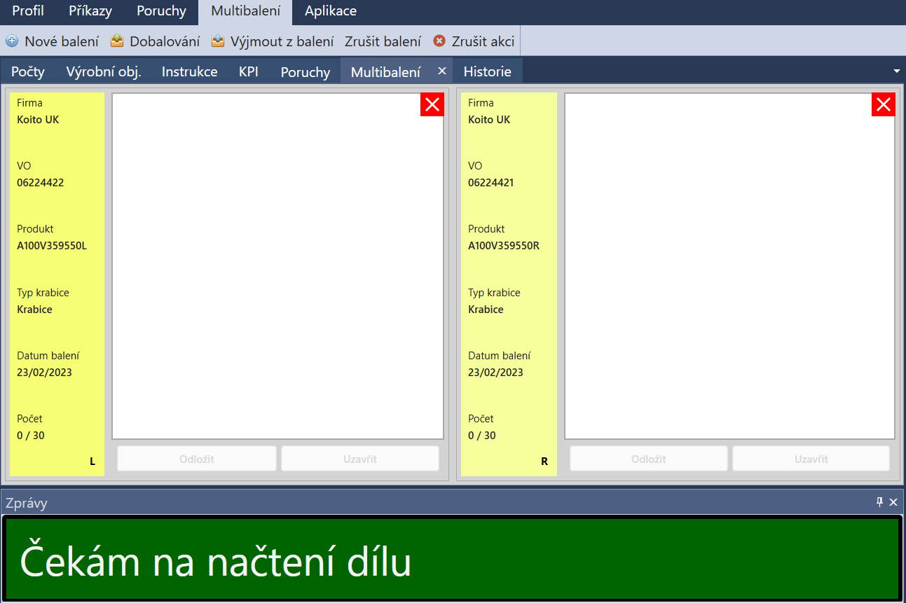 Lze načíst více výrobních objednávek určených k zabalení zároveň. Díly se přiřadí do příslušného balení podle výrobní operace, ve které byly díly vyrobeny.