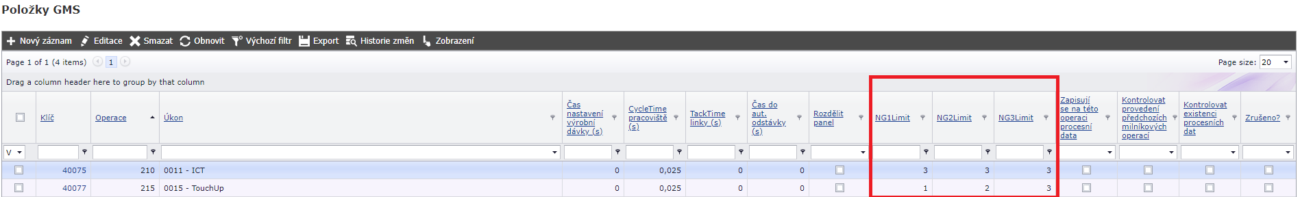 Na webu je potřeba v Obecném nastavení výroby (GMS) pro danou operaci nastavit NG limity, pokud ponecháme hodnotu 0, pak je limit nekonečno.