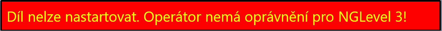 Pokud uživatel nemá oprávnění pracovat s daným NGLevelem, který má díl tak je při pokusu o nastartování práce s dílem zobrazena hláška, o tom že operátor nemá oprávnění pro daný NGLevel.