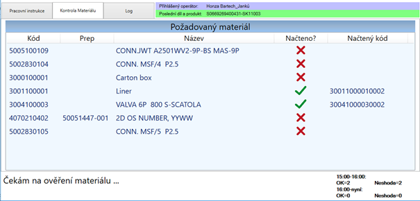 Pokud je podle nastavení xTrace potřeba načítat materiál, otevře se po načtení Produktu v obslužné aplikaci automaticky záložka „Kontrola materiálu“. Uživatel je vyzván k postupnému načítání součástek. Dokud nejsou korektně načteny všechny kódy, program blokuje všechny ostatní funkce. Po úspěšném načtení posledního kódu se program automaticky přepne do záložky „Pracovní instrukce“.