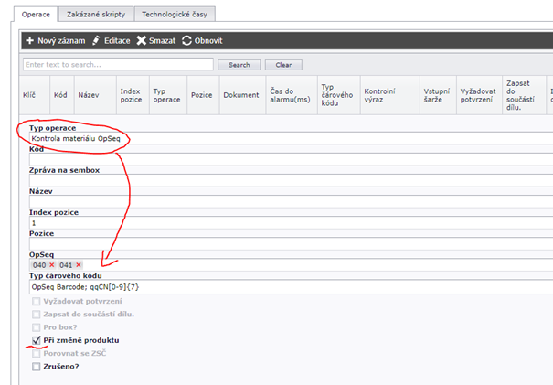 zvolit typ operace Kontrola materiálu OpSeq, čímž se zobrazí dvě nová pole