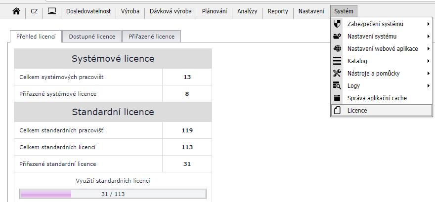 Před zavedením nového pracoviště do xTrace nejprve zkontrolujeme, zda je volná licence. Nejrychlejší způsob je souhrn licencí přímo na xTrace webu (viz screenshot).