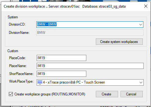 - Zaškrtnutím checkboxu „create workplace groups" se vytvoří automaticky pracoviště i na webu xTrace, které bude mít vlastnosti "routing" a "monitor". (přiřazení do routingu a aktivní v monitorování pracovišť)