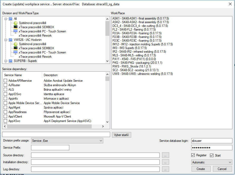 - Source directory:: je zdrojová složka daného pracoviště, kterou najdeme v adresáři složek, na daném serverovém PC u zákazníka (např. cesta: C:\xTrace\workplaces\superb\services