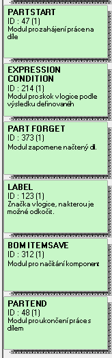 Po PartStart umístíme ExpressionCondition a do parametru napíšeme Part.DoPart.IsLastDetailReused. Pokud díl načtu podruhé a je tedy dříve již rozpracován odskočí na modul Label. Dále PartForget který díl zapomene a díl nechá jako rozpracovaný. Dále je modul Label na který je odskok z ExpressionCondition Za modul Label můžeme dát další modul TupVisualCheck, pokud chceme provézt vizuální kontrolu. Dále už jen uložení materiálu pro díl a konec práce na díle.