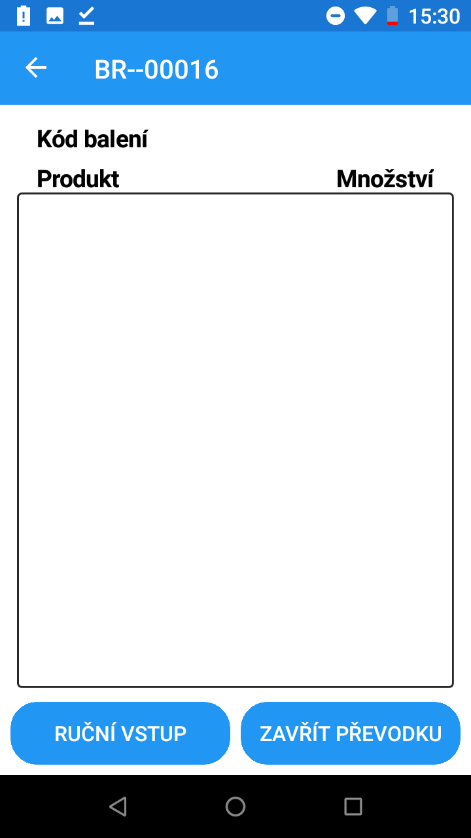 Nebo může operátor nasnímat kód balení pro přidání krabice do převodky.