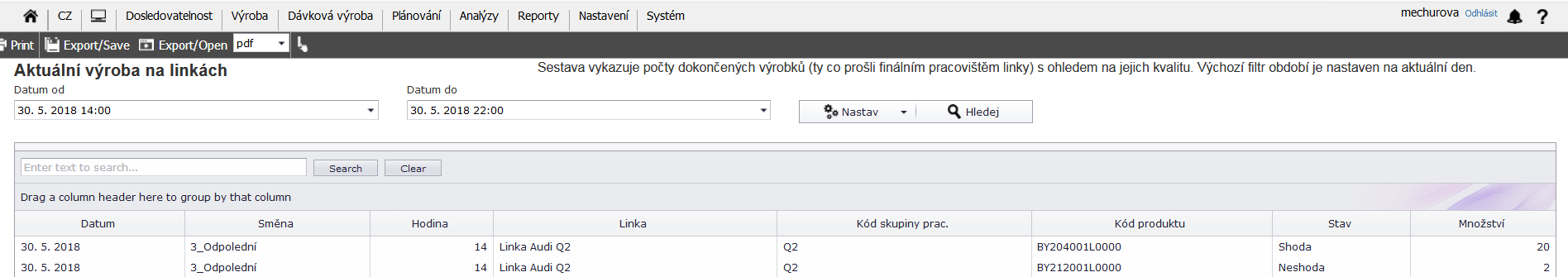 Aktuální výroba na linkách se dá vytisknout, nebo uložit, ale i otevřít již uložená výroba, a to ve formátech pdf, xls a word, za pomocí nástrojové lišty v záhlaví sestavy.