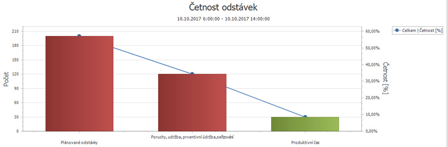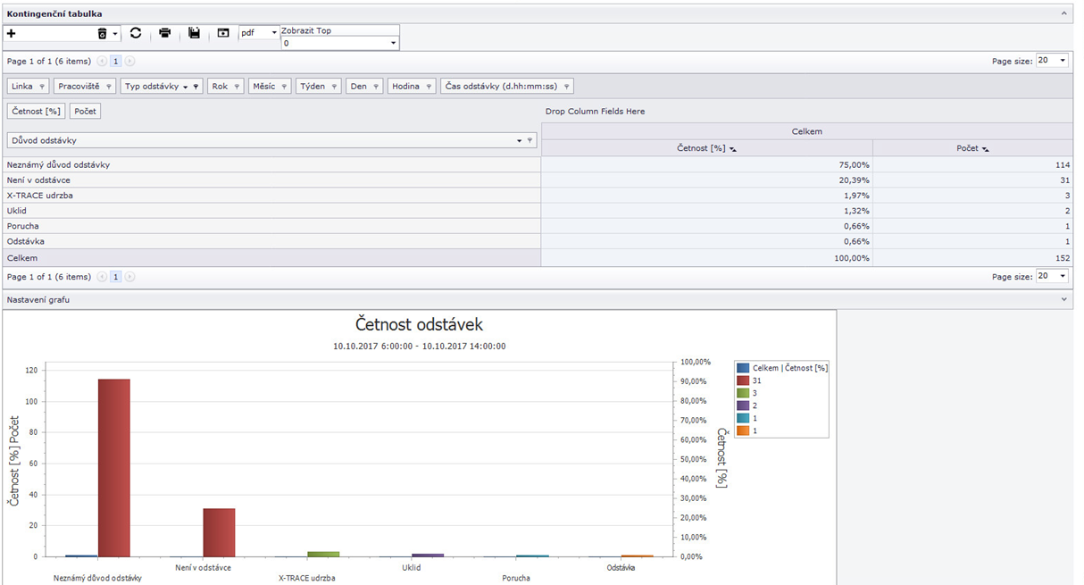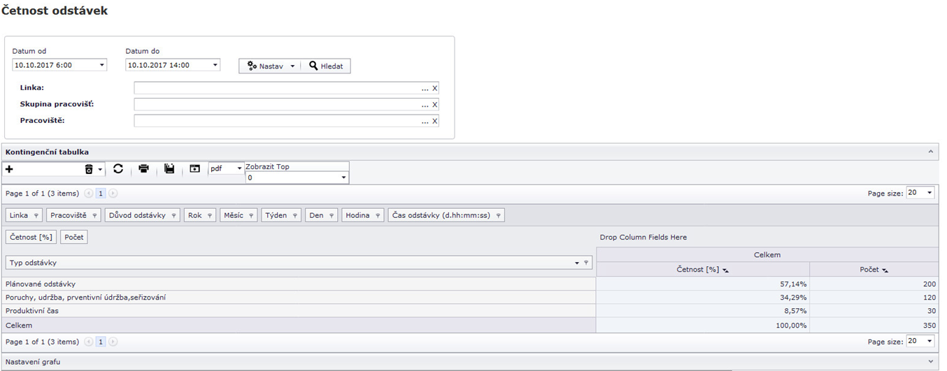 - výstupem je pivotní tabulka s grafem. Na řádkové dimenzi je typ odstávky, zatímco sloupcová dimenze není určena