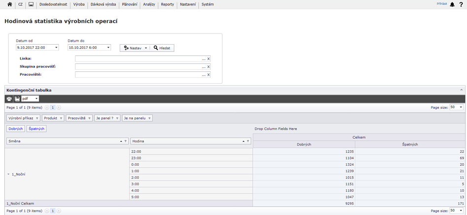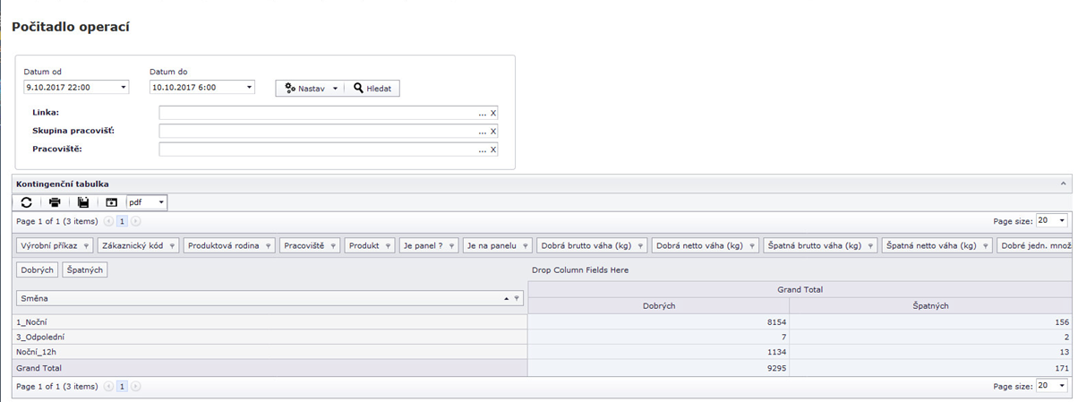 Výstup je seskupen podle směny a zobrazuje počty dobrých a špatných operací