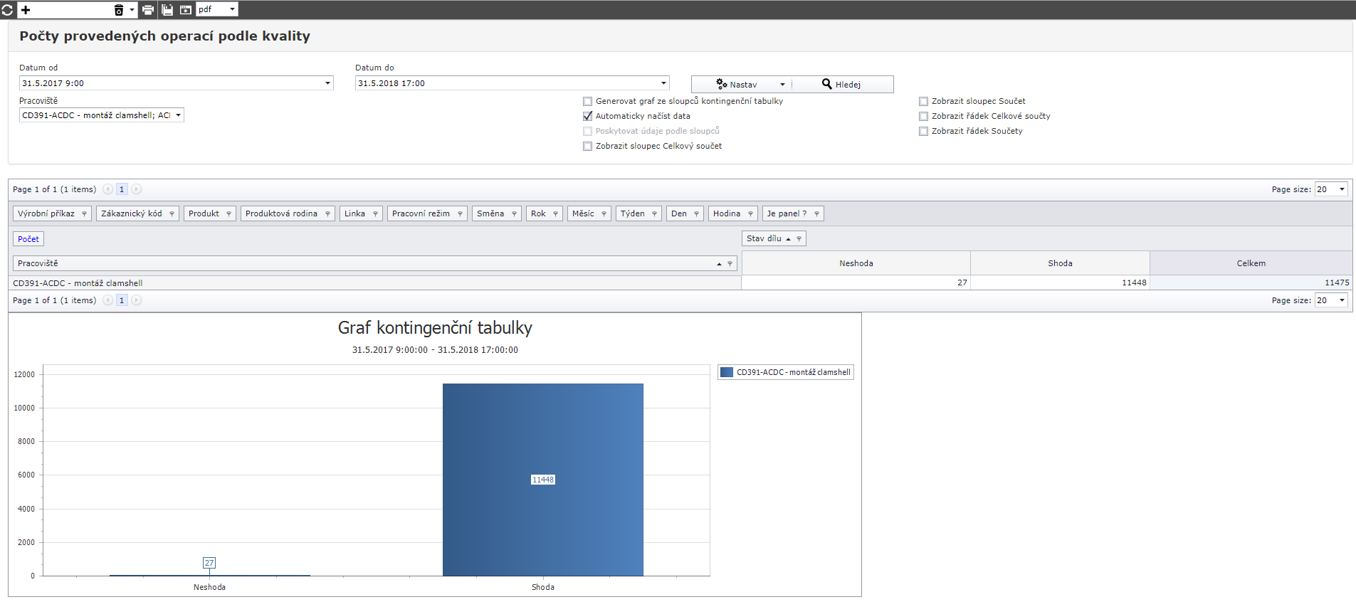 Tato analýza reportuje výrobní operace podle zadaného filtru