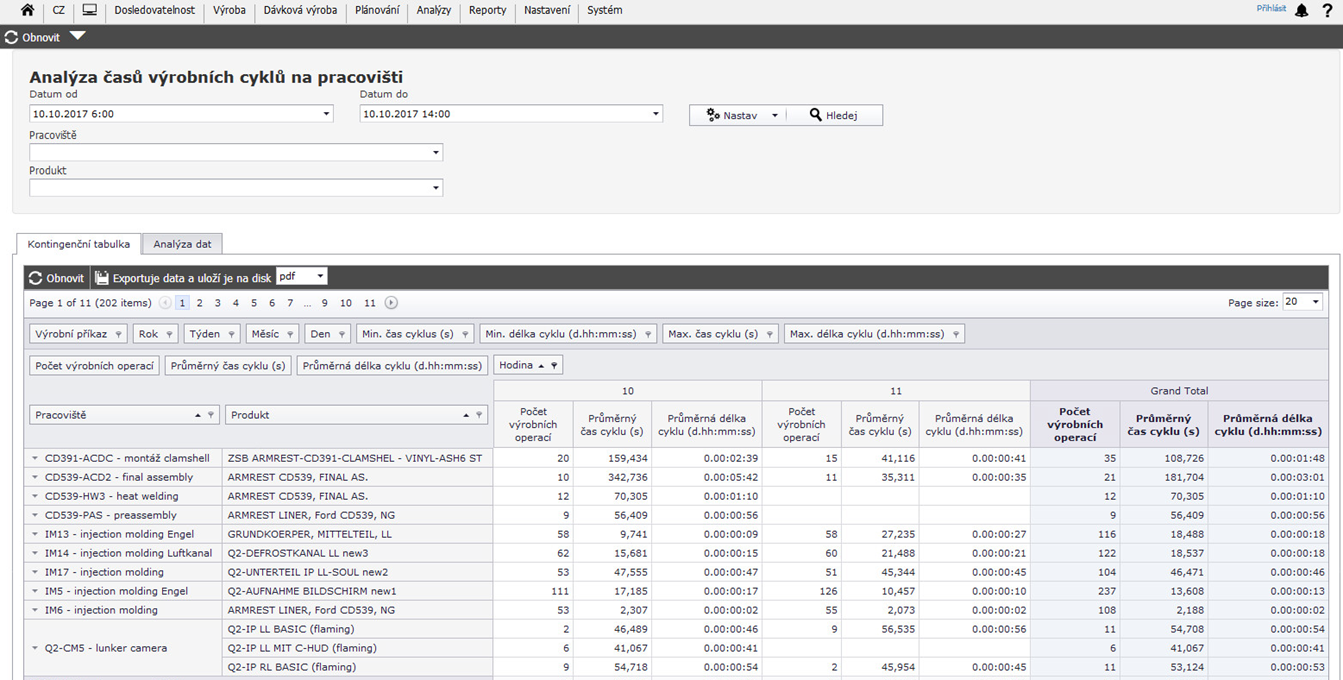 - výstupem je počet výrobních operací, průměrní čas cyklu a průměrnou délku cyklu za vybrané časové období