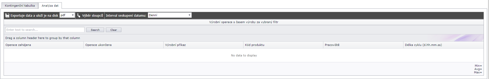 analýza dat zobrazuje souhrn informací o výrobní operaci, její zahájení, ukončení, kterým výrobním příkazem byla použita, u kterého produtku a na kterém pracovišti a jaká je délka cyklu jedné operace
