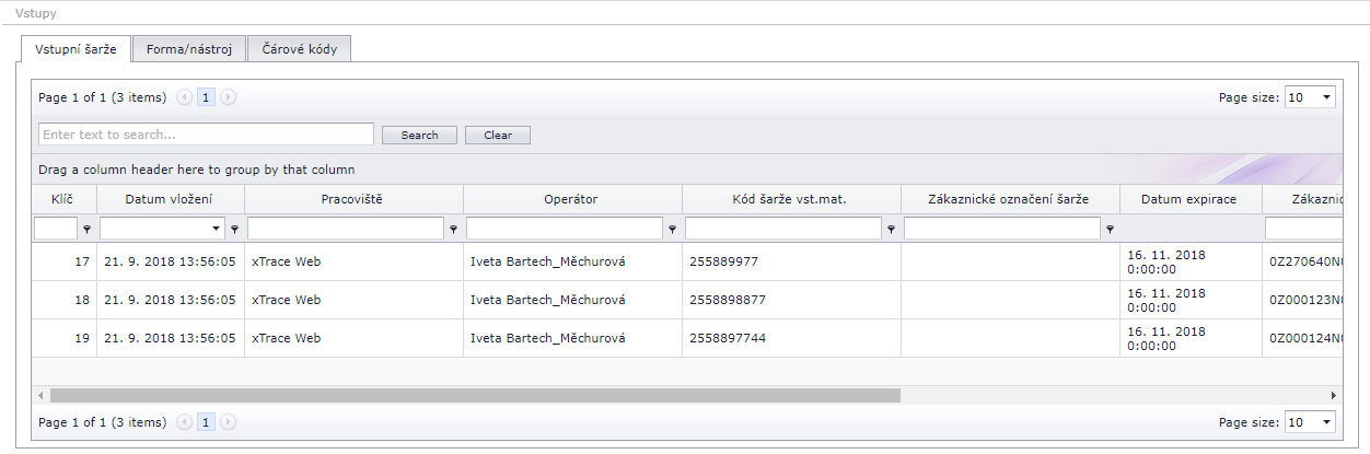Názorná ukázka vstupů vstupních šarží zvolené výrobní objednávky