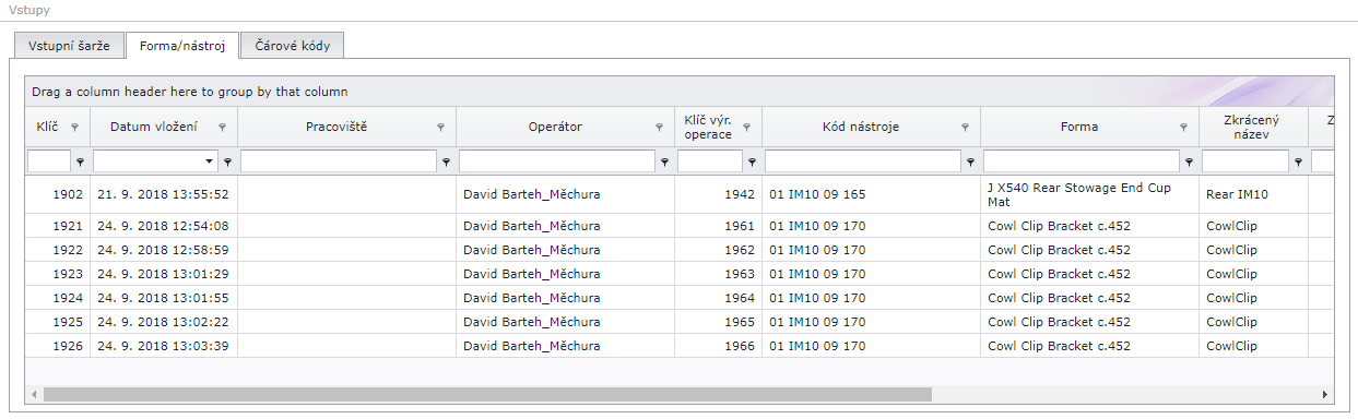 Názorná ukázka vstupů Forem/nástrojů zvolené výrobní objednávky
