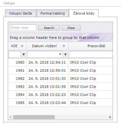 Názorná ukázka vstupů čárových kódů zvolené výrobní objednávky