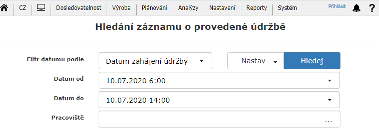V případě nevybrání specifického pracoviště jsou zobrazeny všechny provedené plány údržby v odpovídajícím zadaném časovém období.