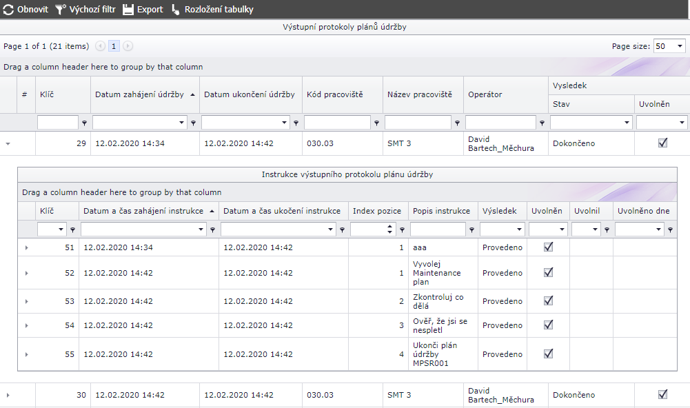 Je možno si upravit rozložení tabulky a také po rozkliknutí šedé šipečky se zobrazí detaily provedené údržby s jednotlivými kroky a výsledky.