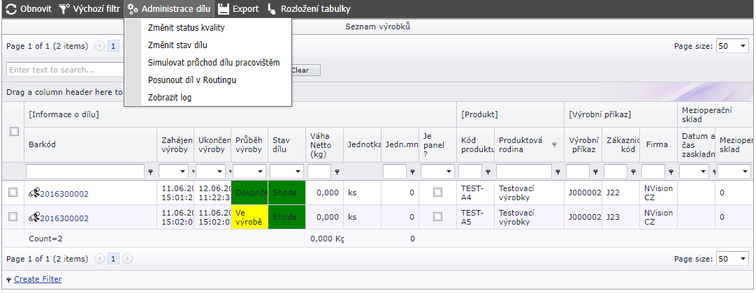 Postup výrobku výrobními operacemi | Přehled průchodu dílu jednotlivými pracovišti. Je zde možno dohledat pracoviště, operátora, čas zahájení i ukončení operace a výsledek operace. |
