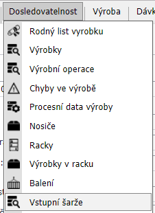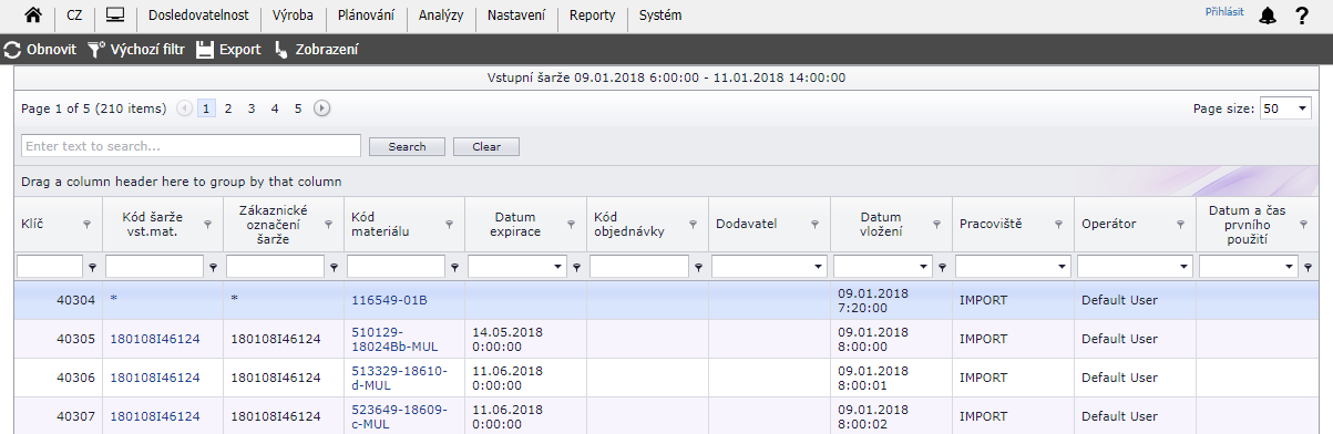 Doporučení: pro hledání vstupní šarže, vyberte jen jedno ze tří kritérií Linka, Skupina pracovišť, Pracoviště. Vyhledávací funkce by totiž nemusela najít požadované šarže, pokud by byly zadány všechny kritéria. Doporučejeme tedy, pro rychlejší dohledávání ať už šarží, ale i jiných dat, použít jen kritérium pracoviště, nebo skupinu pracovišť.