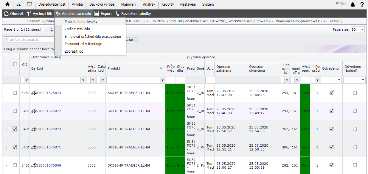 V zobrazených výsledcích můžete pomocí Administrace dílu hromadně změnit stav všech označených dílů