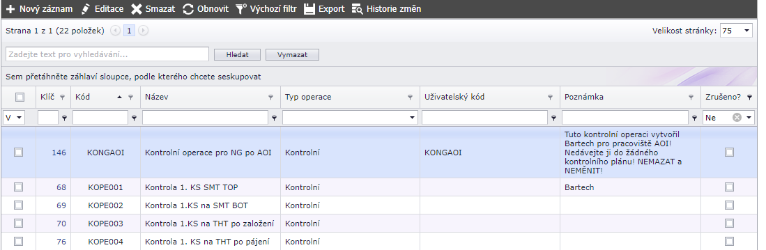 Kód: Kódové označení kontrolní operace, musí být unikátní