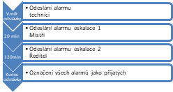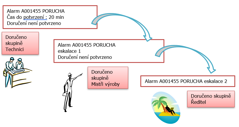 Každý alarm, definovaný v systému xTrace může mít nastavenu eskalaci. Alarm je doručován skupině příjemců. U eskalace je možno definovat čas, do kterého musí být alarm potvrzen. Pokud není splněn tento časový limit, je tentýž alarm odeslán další skupině příjemců. Takto může být eskalován násobně. V případě potvrzení kýmkoliv z eskalované skupiny je považován celý alarm za doručený. Potvrzení přijetí alarmu lze provézt přes webové rozhraní, nebo přímo na pracovišti zadáním PIN kódu.