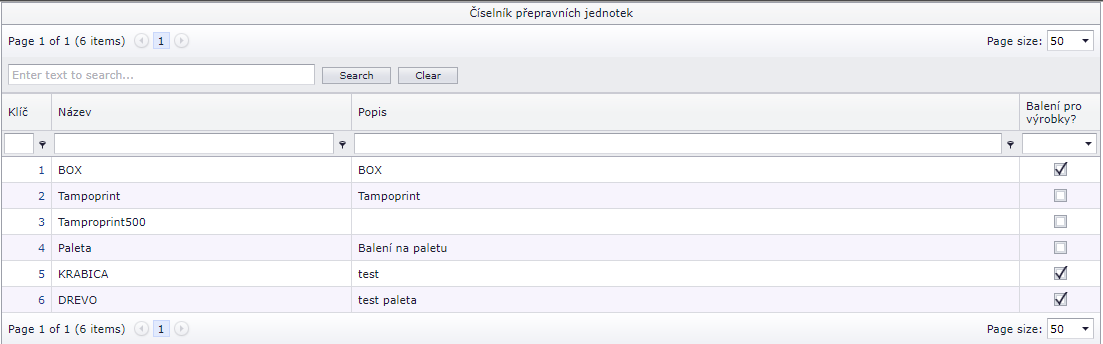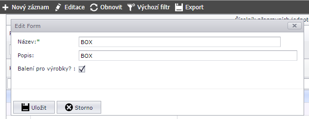 Zde zavádíme typ přepravních jednotek, udáváme popis, název přepravní jednotky a jestli je určeno balení pro výrobky. Je zde možnost určit typ balení i pro celkově zabalené výrobky např. paletu.