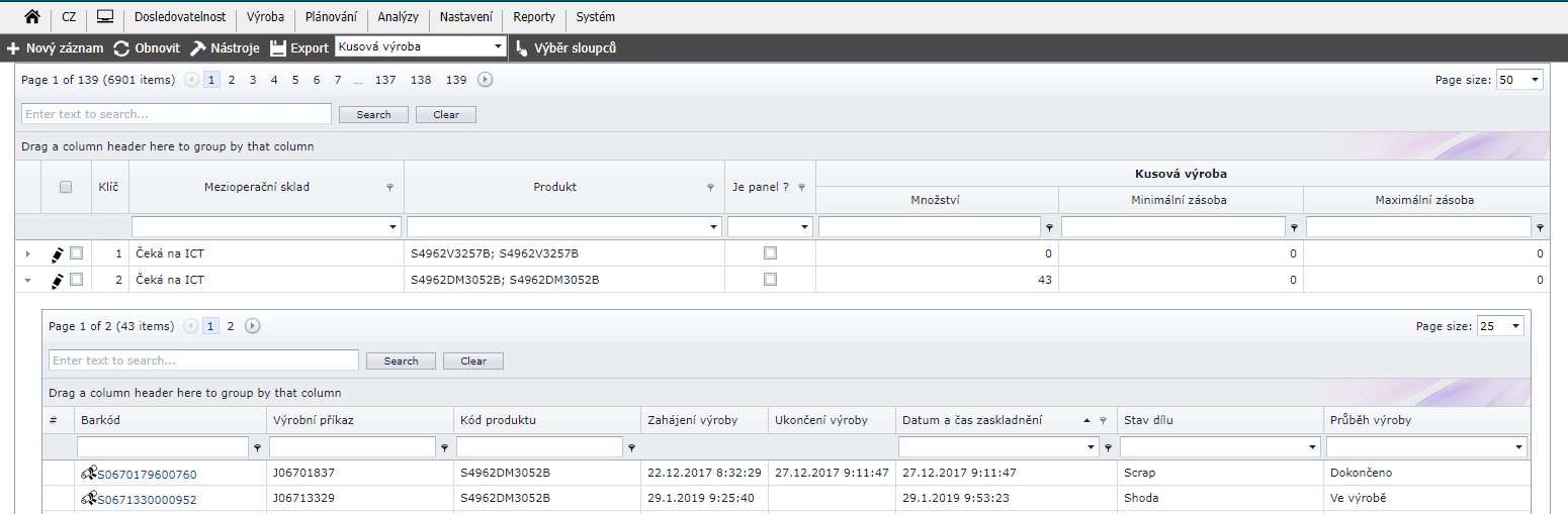 Kde vidíme mezioperační sklady, jaký produkt se v nich nachází a množství, zase se zde dá zobrazit všechny díly, které se v mezipoperačním skladu nacházejí, a jejich zahájení, ukončení výroby, jaký je stav dílu (shoda, neshoda, scrap) a průběh výroby (ve výrobě, dokončeno)