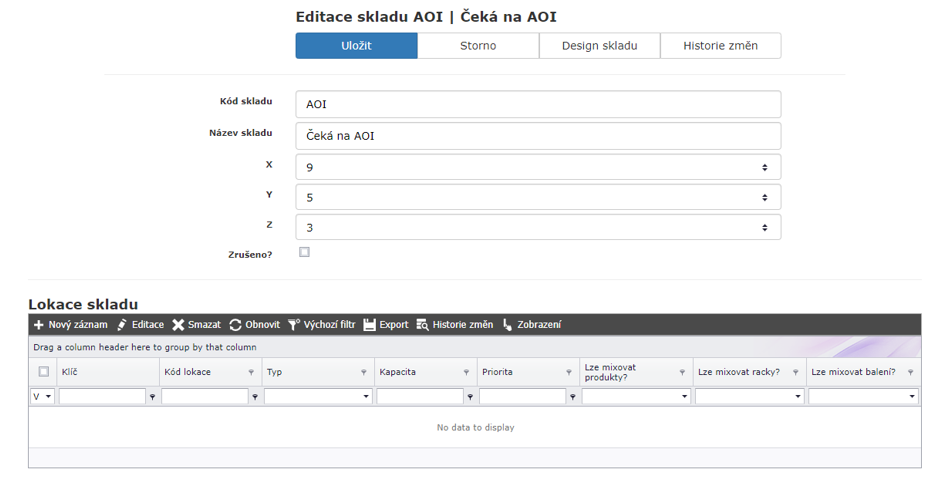 Tlačítka v záhlaví Uložit, Storno slouží kuložení změn týkajících se kódu a názvu skladu, nikoliv k ukládání lokací skladu. To se děje automaticky při uložení nové lokace skladu.
