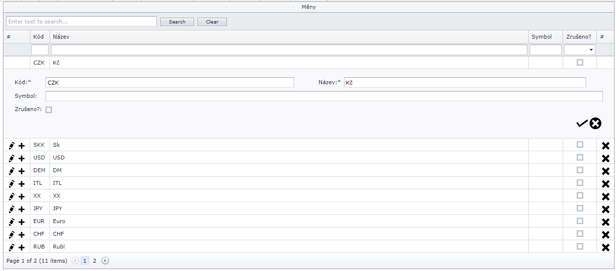 Novou měnu zavedeme pomocí tlačítka "+" plus v prvním sloupci, pokud budeme chtít editovat měnu, zvolíme v prvním sloupci "tužku".