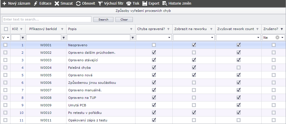 Po opravě dílu na reworku je nutno k chybě přiřadit stav chyby – způsob jakým byl díl opraven. Stavy chyb lze volitelně zadávat a editovat v této sekci.