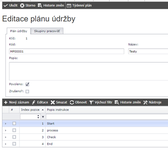 - Pokud není zaškrtnuto pole Povoleno, daná instrukce není povolena pro tento editovaný plán údržby.