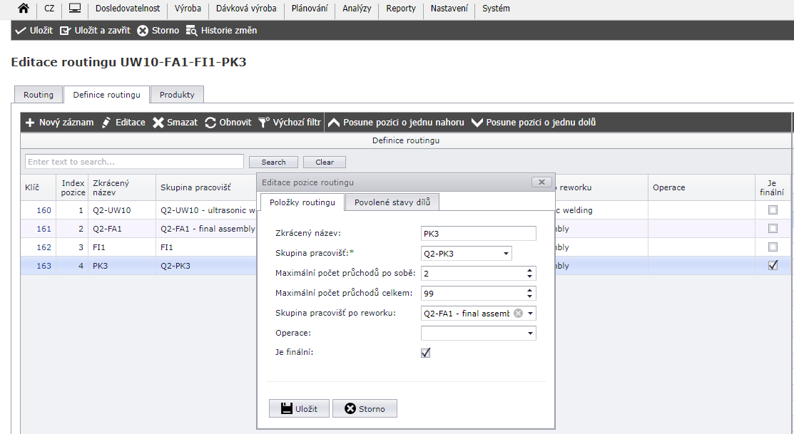 V nastavení routingu je u jednotlivých pracovišť možnost zaškrtnout políčko JE Finální
