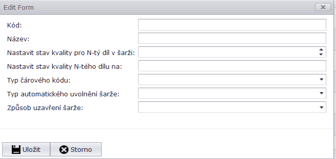 V menu "Nastavení -> Procesy výroby -> Výrobní šarže" lze vytvořit nastavení šarží s následujícími parametry:
