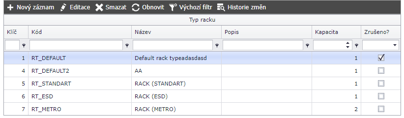 Zde se definuje typ racků, pokud jich ve výrobě existuje více.