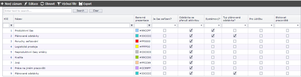 Poznánka: Uživatel může systémem nastavené Typy odstávek změnit podle své potřeby.