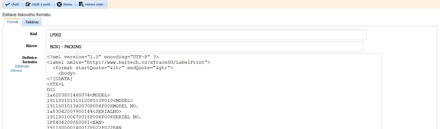 je zde i hypertextový odkaz na sestavení formátu v DPL jazyku pro tiskárny typu Datamax