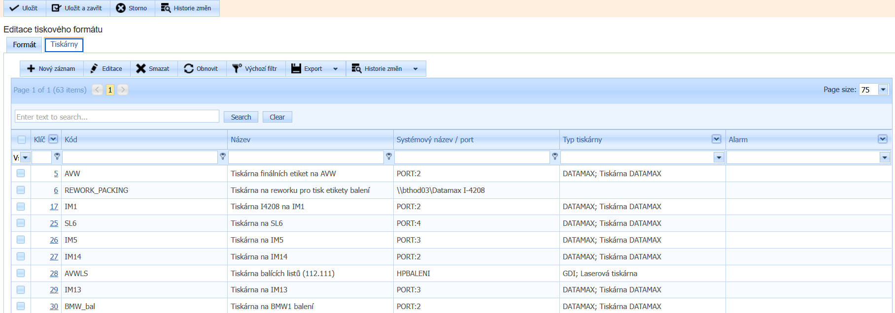druhou záložkou Tiskárny je číselník tiskáren, kdy k tomuto formátu můžeme vybrat (checkboxem) na které tiskárně se formát bude tisknout