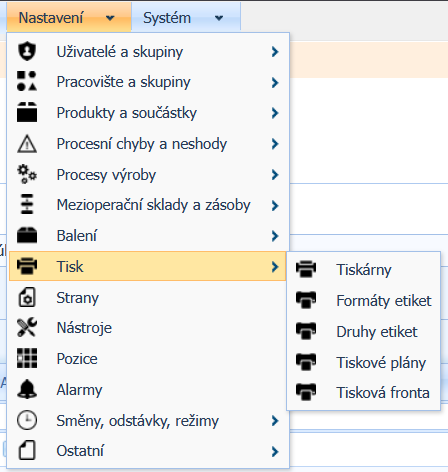 Záložka tisku obsahuje nastavení a definování tiskáren, formátů štítků, druh štítků, tiskových plánů a také tiskové fronty, souhrnu co bylo vytištěno.