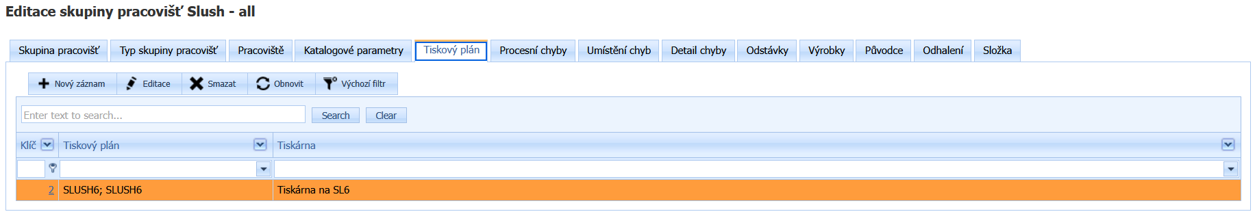 poslední nastavení se provádí u skupiny pracovišť, kde je možné nastavit jinou tiskárnu než u tiskového plánu.