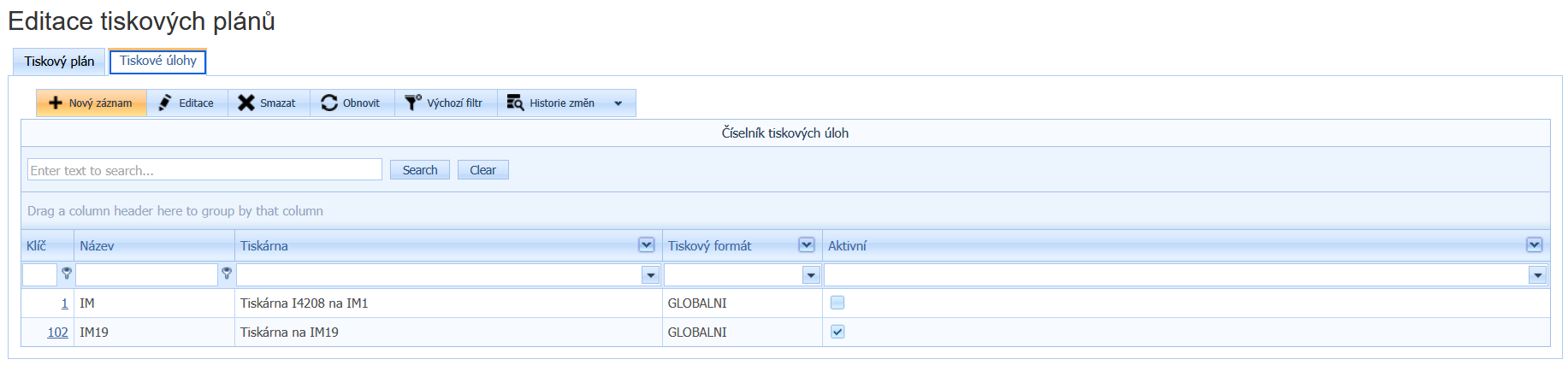 Novým záznamem v číselníku tiskových úloh, v editaci tiskového plánu, novým záznamem spustíme podokno pro definování nové úlohy