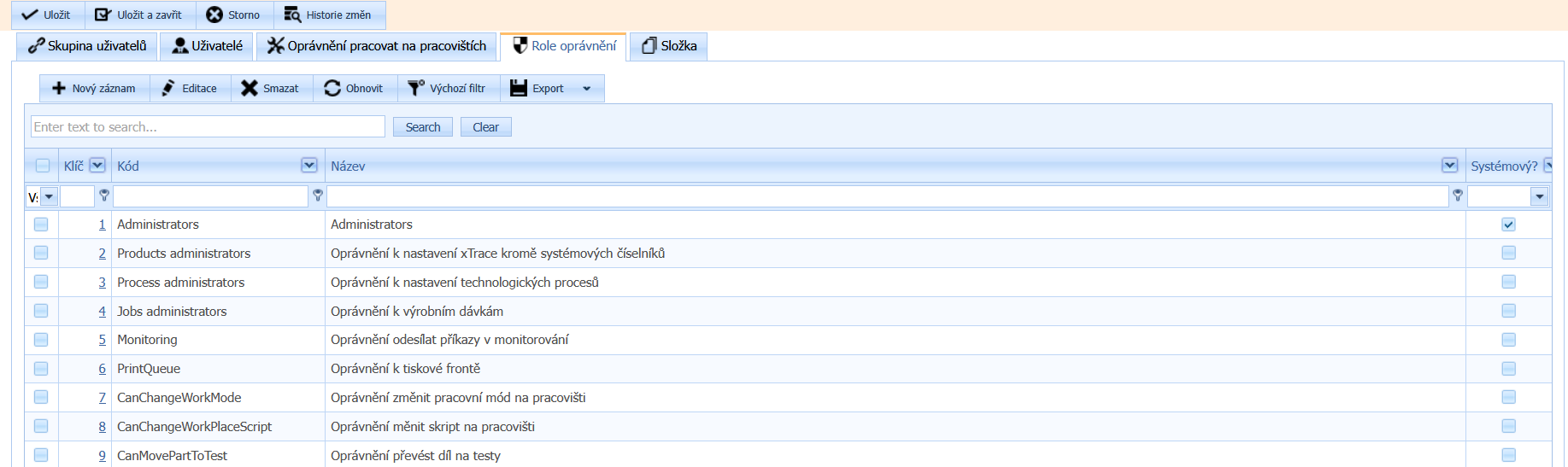 Systémový: parametr který stanovuje adiminstrátor systému xTrace a bývá to skupina uživatelů, která je nezbytná pro chod xTrace - např. skupina - Administrators