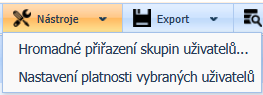 Export - umožňuje exportovat vybraná data (uživatele) do formátu xls, pdf, csv