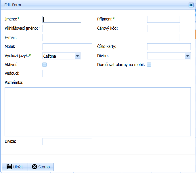 Nového uživatele může zavést uživatel s právy administrátora, pomocí Nového záznamu na nástrojové liště se mu otevře editační okno nového uživatele (u údajů se znakem * jsou povinná pole pro vyplnění)