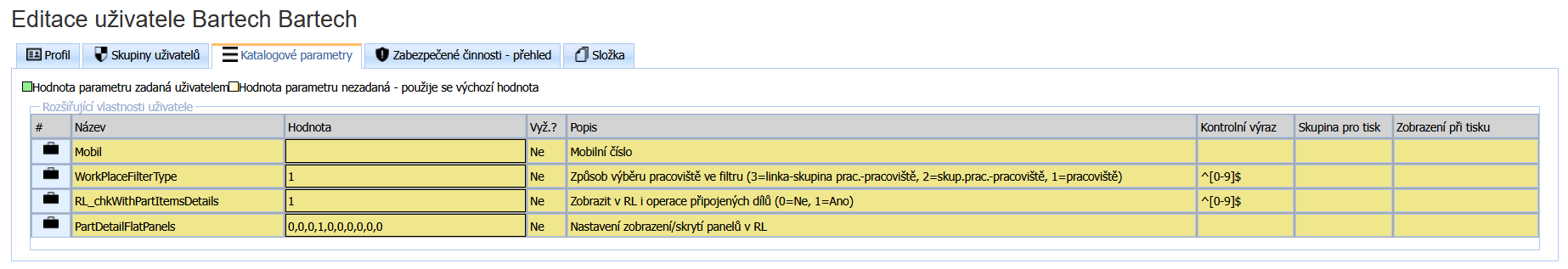 Katalogové parametry uživatele, jsou pro nastavení parametru uživatele, který se bude později v určité sestavě zobrazovat, nebo se bude tisknout spolu s údaji na štítku atd., Katalogové parametry se dají uživatelsky upravovat