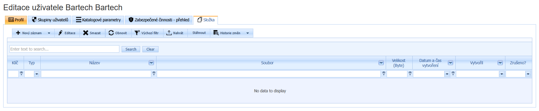 Zde můžete ukládat soubory o daném uživateli, které o něm evidujete mimo systéme xTrace, tak abyste měli všechny informace o uživateli komplexní, a to pomocí tlačítka pro nahrání souboru na nástrojové liště