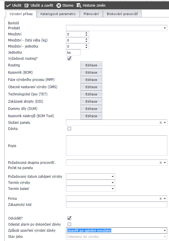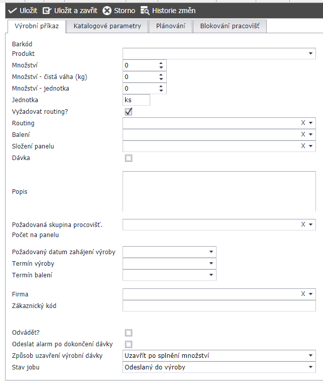 Barkód: Číslo výrobní dávky – generuje se automaticky po prvním uložení celé editace JOBU. Načtením čárového kódu výrobní dávky nebo výběrem ze seznamu se na vstupním pracovišti (1. pracoviště v routingu) určuje výrobní dávka a tím i produkt.